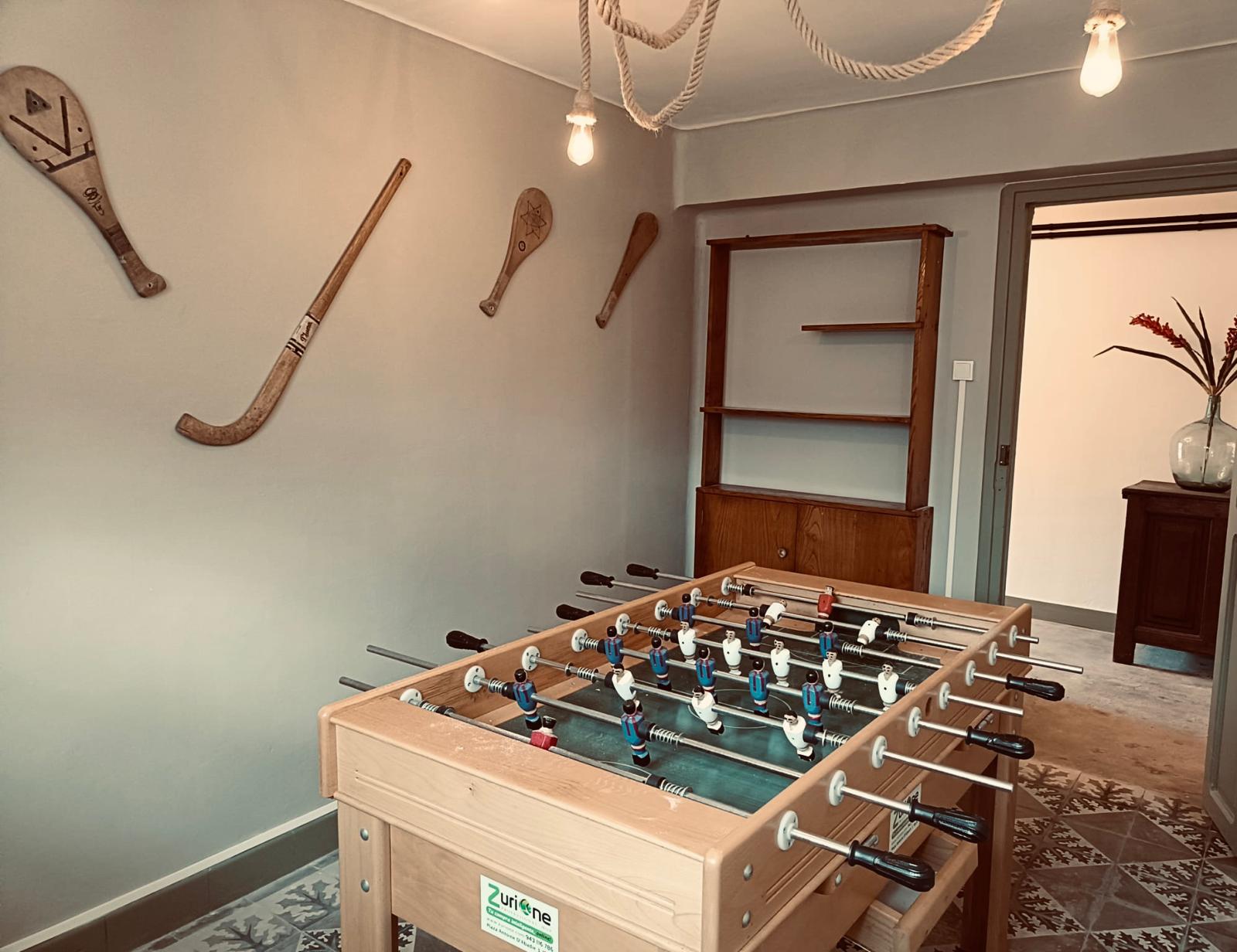 En planta baja se va a encontrar con diversas estancias de uso común: otro salón que comunica al jardín, zona de juegos, sala de futbolín independiente, sala con mesa de cartas independiente, garaje con espacio para guardar las bicis, área de mantenimiento y limpieza de bicis, zona de almacenamiento de material deportivo, baño con ducha…